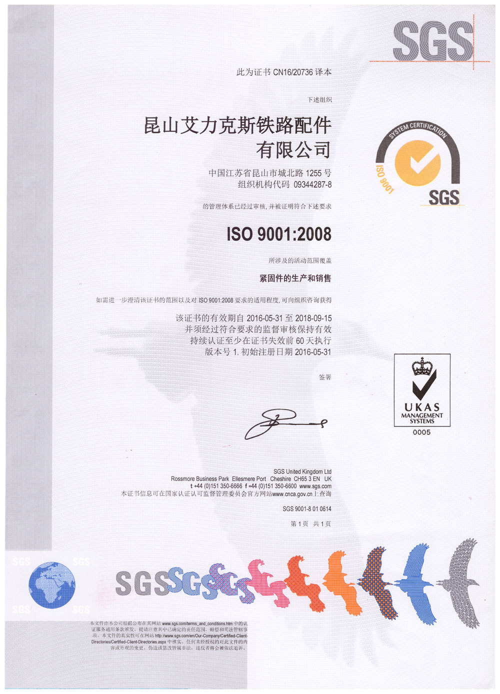 昆山艾力克斯铁路配件有限公司是一家通过ISO 9001/2008认证的公司。所有的流程都按照ISO质量管理体系的要求,从供应商的质量控制到成品,我们都是按照标准程序操作,对供应商我们有严格的质量控制系统: