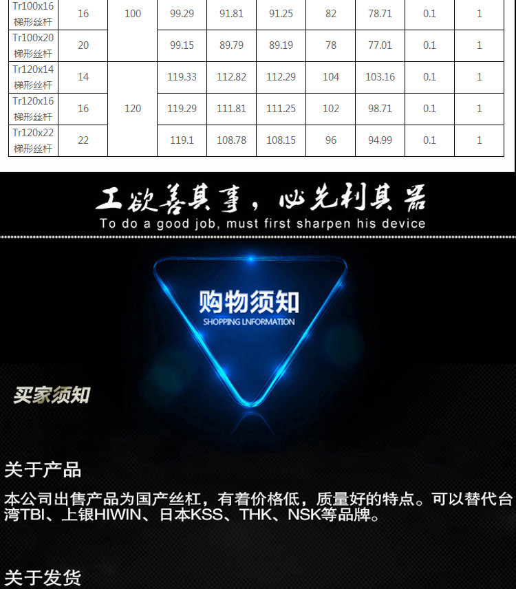 梯形丝杠/往复丝杠/滚珠丝杠/矩形丝杠/三角丝杠/圆弧丝杠/锯齿形丝杠/方牙丝杠/细小丝杠/微型丝杠/矩形丝杠/左右牙滚珠丝杠/不锈钢丝杠/反牙丝杠/蜗轮蜗杆/花键轴/槽轴/齿轮/齿条等大量现货有螺母配一件起订 百度:蓝冰丝杠 有更多的现货等着大家 1件起订 端部加工 大量批发