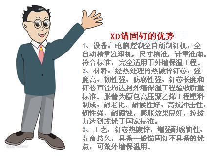 锚固钉是连接墙体和保温板之间的一种固件,由镀锌螺丝、尼龙涨管和固定圆片组成。根据保温层厚度的不同,分为多种规格。广泛用于建筑装潢中。