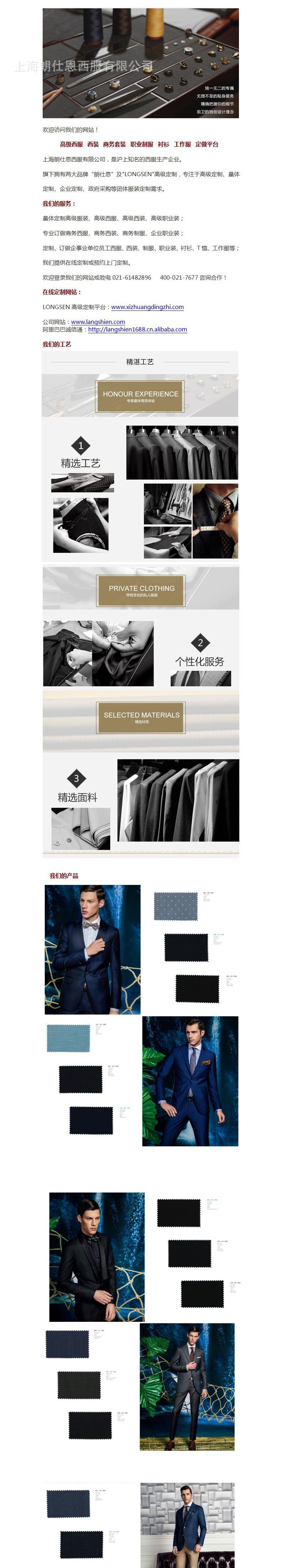 产品信息名称:西服定制 衬衫定制 职业套装定制 工作服定制品牌:朗仕恩LONGSEN货号:定制款,公司提供多款面料,多款颜色,多种款式做参考颜色:多色可选产品特点 公司旗下品牌 LONGSEN朗仕恩顶级奢华定制,采用经典版型设计,理念源自欧洲,倍显尊贵,典雅;结合精湛的手工裁剪,成就品牌产品的精致、时尚、个性、品味。 LONGSEN朗仕恩高级西装定制面料来自英国、意大利及国内知名品牌,高支高密度的面料手感细腻,弹性丰富,轻便且舒适。尊贵的品质,奢华的定制为全球少数人身份和品味的象征。