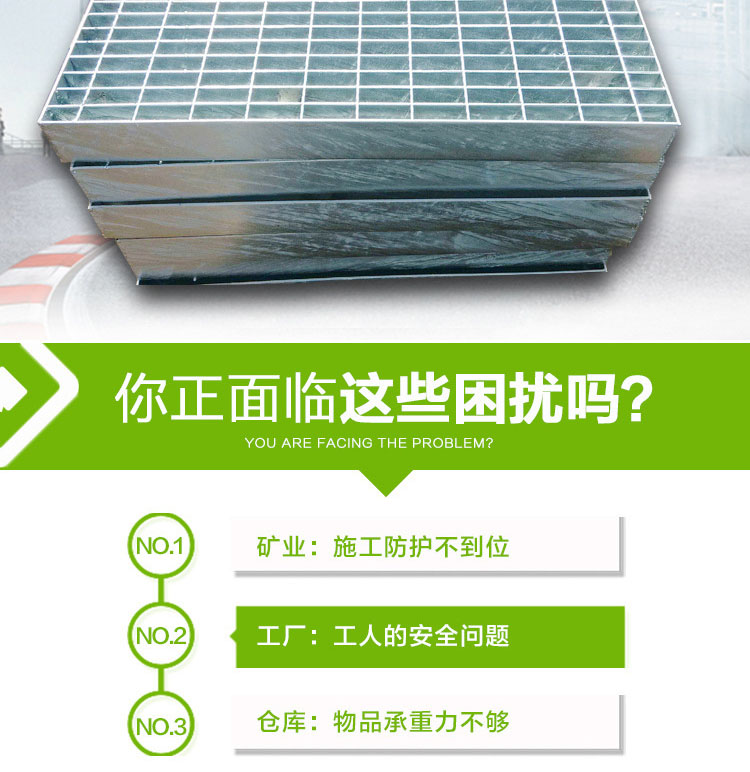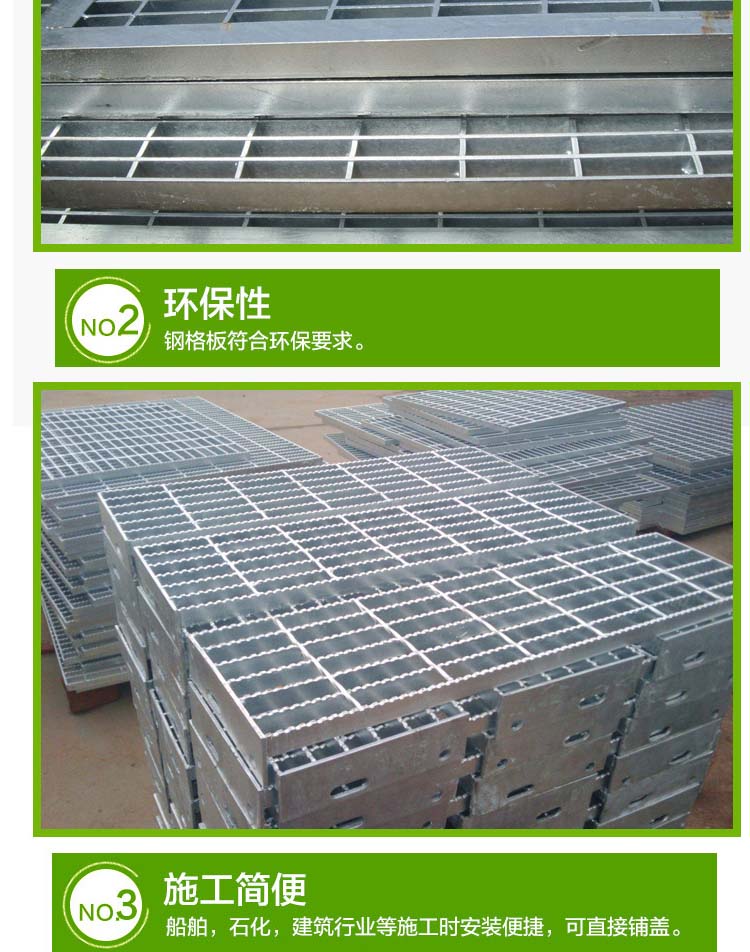 采用Q235或不锈钢,扁钢间距一般采用:30、40mm,横杆间距一般采用:50、100mm 宽:20-60(mm) 厚:3-50(mm) (也可按客户要求专业定做) 二、钢格板分类: (1) 按其负载扁钢侧表面形状分为:齿形和平板形。 (2) 按扁钢规格,间距和方钢排列间距不同,可组合成数百个规格品种 根据不同的使用环境,可对其表层进行热浸镀锌,喷漆,刷防锈油等防护处理,也可采用不锈钢材料表面不加处理。 三、优越性及用途: (1) 钢格板高强度,轻结构、高承载,结构轻,便于吊装等,外形美观,经久耐用,具有通风,采光,散热,防滑,防爆等性能。在PH 6至PH 12.5范围内,锌层表面形成稳定的保护膜,耐腐蚀性能好。 (2) 广泛用于发电厂,化工厂,炼油厂,钢铁厂,造纸厂,机械厂,水泥厂,市政工程,污水处理厂,环卫工程等领域的平台,走道,沟盖,井盖,梯子,围拦,护拦等。