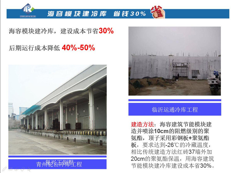 这种模块是内外两层保温,保温层与墙体一体化,不用喷涂聚氨酯,保温效果明显,后期运营成本低,在临朐寺头镇,逯家庄就有用模块建的冷库,户主预计用40万,结果省了10万。
