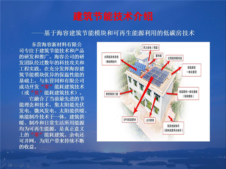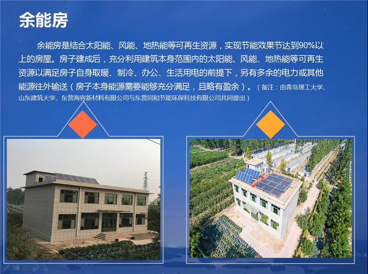 用海容模块建房墙体内外两层保温,导热系数低,仅为0.028w/m·k,比国家标准要求的0.06w/m·k还要低,节能指标高于92%(山东省在编最新被动式超低能耗绿色建筑要求,比普通建筑节能92%以上)。在华北、西北地区用海容模块建房,冬天不用生火炉,仅靠阳光照射和家用电器产生的热量,室内温度就能达到15-22℃;夏天不用开空调,只要通过调节窗帘,避免阳光直射入室内,室内温度就能保持在27℃以下,真正实现冬暖夏凉,大大降低能耗。将海容模块用于绿色建筑,推动绿色建筑的“市场化”进程,实现生态环境、经济、社会的平衡。