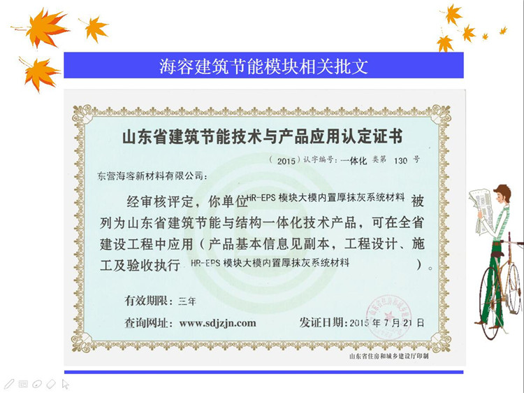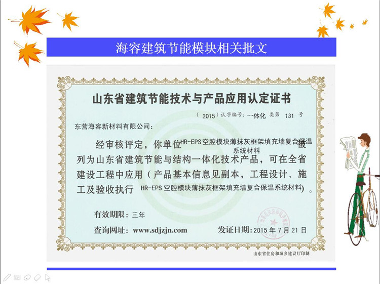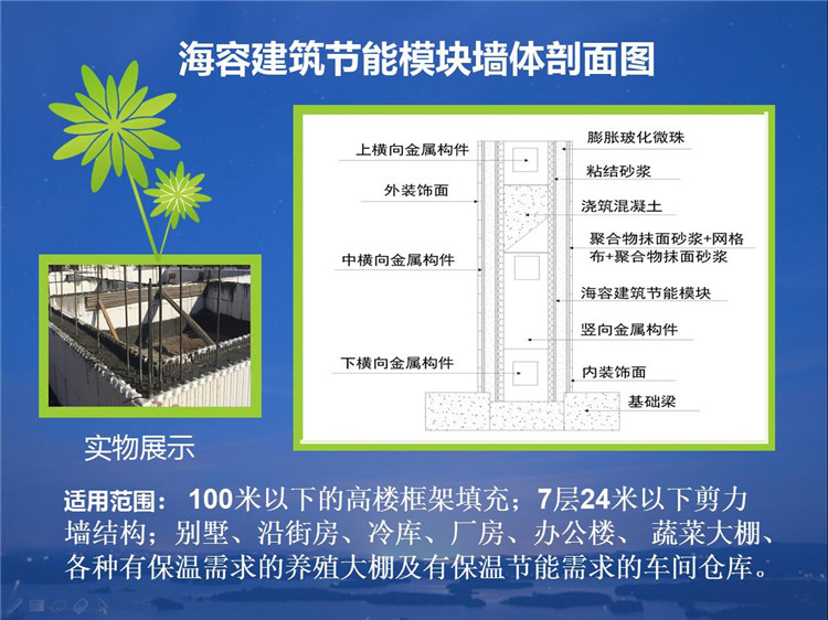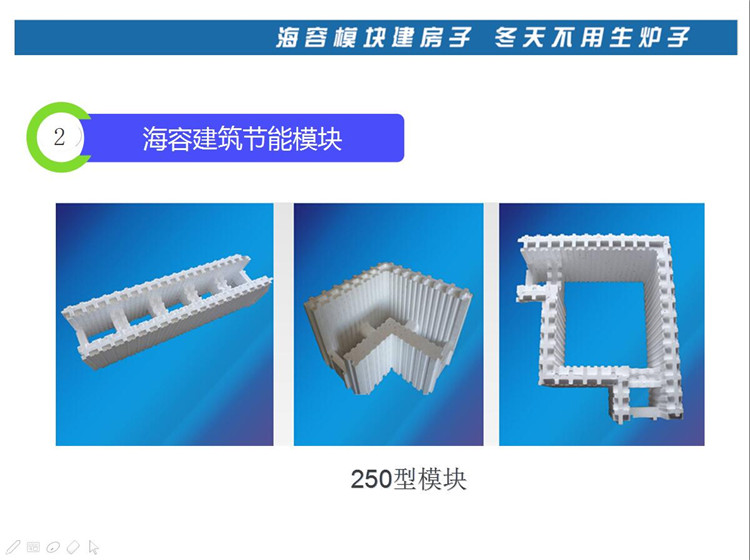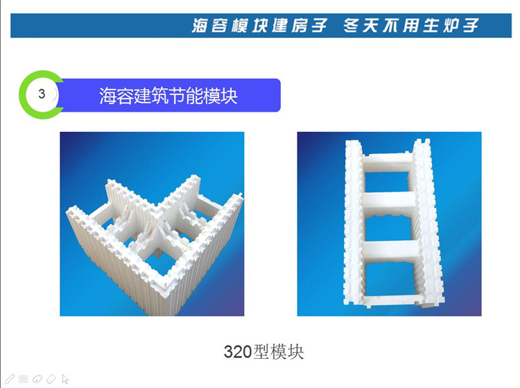 属于新型墙体材料,墙体内外两层保温,导热系数低,仅为0.028w/m·k,比国家标准要求的0.06w/m·k还要低,在华北、西北地区用海容模块建房子,冬天不用生火炉,仅靠阳光照射和家用电器产生的热量、室内温度就能达到15-22℃。膨胀玻化微珠海容模块浇筑式节能建筑体系已申报国家新型城镇化备选方案,是国家新农村建设的备选方案之一。