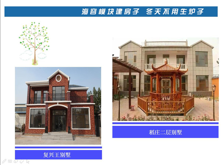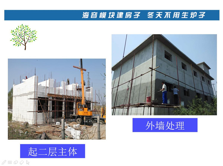 海容模块盖房子保温效果好、导热系数低、尺寸稳定性好、强度高且韧性好、粘结强度高、施工性好、耐候性优异、综合成本低、防火等级B1级、建筑节能一体化。海容模块盖房施工省工、省料、造价低、建筑修复方便、有较好的经济指标。
