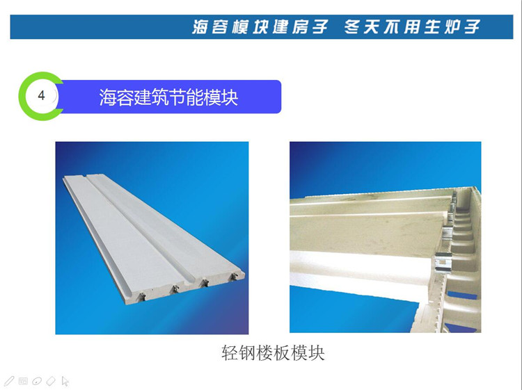 随着社会发展,国家实行墙体改革政策,以实现保护土地、节约能源的目的材料为新型墙体材料。海容模块保温效果好:墙体内外两层保温,导热系数低,仅为0.028w/m·k,比国家标准要求的0.06w/m·k还要低,在华北、西北地区用海容模块建房子,冬天不用生火炉,仅靠阳光照射和家用电器产生的热量、室内温度就能达到15-22℃。