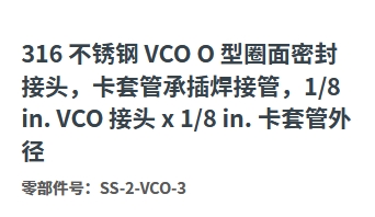 316 不锈钢 VCO O 型圈面密封接头,卡套管承插焊接管,1/8 in. VCO 接头 x 1/8 in. 卡套管外径