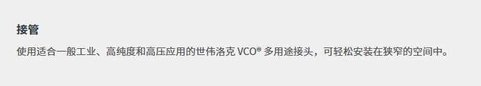 使用适合一般工业、高纯度和高压应用的 VCO® 多用途接头,可轻松安装在狭窄的空间中。