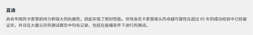 具有牢固的卡套管抓持力和强大的抗振性,因此实现了密封性能。卡套管接头的卓越可靠性在超过 65 年的成功经验中已经被证实,并且在大量公开的测试报告中均有记录,包括在极端条件下进行的测试。