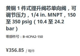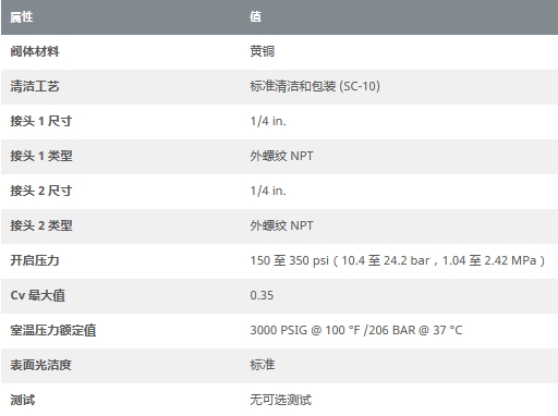 黄铜 1 件式提升阀芯单向阀,可调节压力,1/4 in. MNPT,150 至 350 psig(10.4 至 24.2 bar)