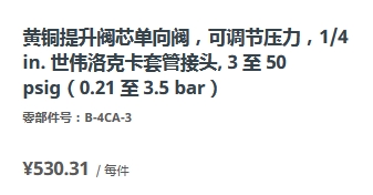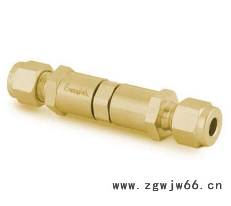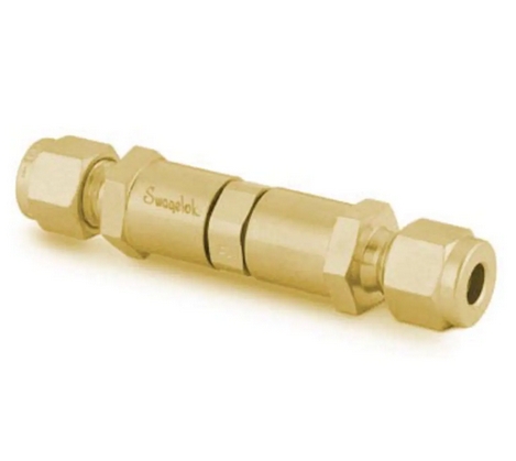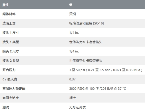 黄铜提升阀芯单向阀,可调节压力,1/4 in. 卡套管接头, 3 至 50 psig(0.21 至 3.5 bar)
