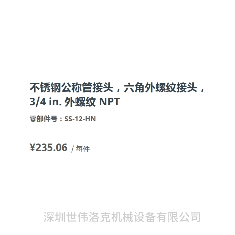 不锈钢公称管接头,六角外螺纹接头,3/4 in. 外螺纹 NPT