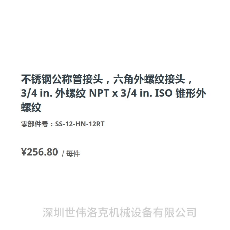 不锈钢公称管接头,六角外螺纹接头,3/4 in.