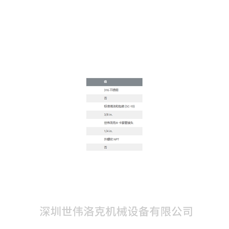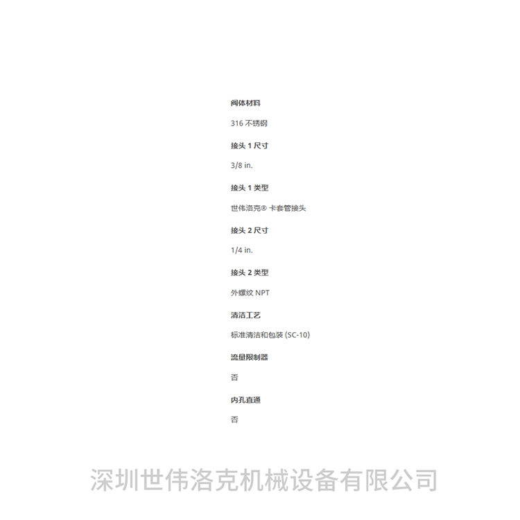 零部件号:SS-600-11-4 316 不锈钢 阀体材料 3/8 in. 接头 1 尺寸 卡套管接头 接头 1 类型 1/4 in. 接头 2 尺寸 外螺纹 NPT 接头 2 类型 标准清洁和包装 (SC-10) 清洁工艺 否 流量限制器 否内孔直通