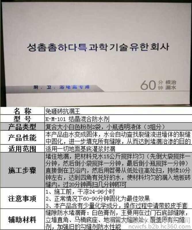 免砸砖防水堵漏王60分钟轻松搞定厨房卫生间漏水难题,施工简单,不刨不砸,无痕堵漏,家庭漏水自己轻松搞定,经济实惠又实用。欢迎广大客户咨询下单,60分钟还你清爽干净的家!订购热线:18879689728,微信:ncwcfs