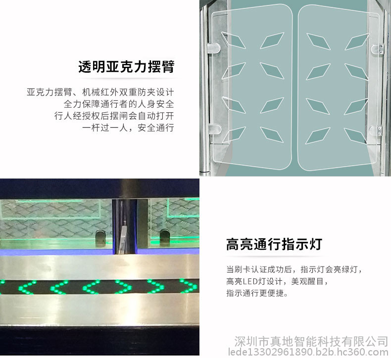 (6)防尾随通行功能:光电开关检测行人通行状况,检测到尾随现象(后面的人贴着前面的人,意图不刷卡**通过)后系统会自动报警,同时将闸摆上锁并停止动作。