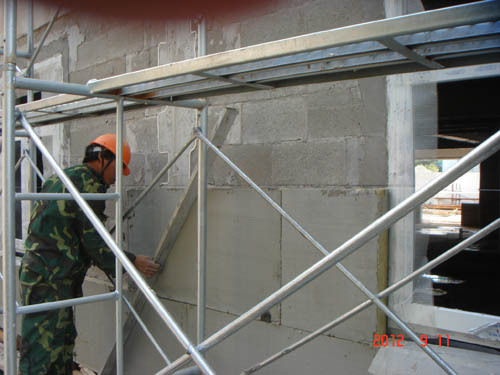 岩棉保温板是以精选的优质玄武岩为主要原料,经高温融化后,采用国际先进的四辊离心制棉工序,将玄武岩棉高温溶体甩拉成4~7μm的非连续性纤维,再在岩棉纤维中加入一定量的粘结剂、防尘油、憎水剂、经过沉降、固化、切割等工工艺,根据不同用途制成不同密度的系列产品防火岩棉卷毡-岩棉板。具有质轻、导热系数小、吸声性能好、不燃、化学稳定性好等特点。岩棉保温板是一种新型的保温、隔燃、吸声材料。岩棉板除具有一般岩棉所具有的特点之外,还具有防水、保温、绝热隔冷等性能,有一定的化学稳定性,即使在潮湿情况下长期使用也不会发生潮