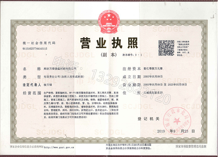廊坊万福保温材料有限公司是省内为数不多生产加工聚氨酯保温管的专业厂家,保温管厂家,具有高素质工作人员50人,占地面积15000平方米,企业实力雄厚,生产能力强。目前主要从事研究聚氨酯开发、设计、施工为一体.有着多年保温管、高密度聚乙烯保温外护管、聚氨酯pir管壳的生产与销售经验。公司主要经营范围包括:聚氨酯发泡保温管、预制直埋保温管、黑夹克保温管、钢套钢蒸汽保温管、供热管道、热力管网、供暖管道、塑套钢架空管道、聚氨酯保温管壳、pir深冷管壳、管件等保温管类产品生产与销售。
