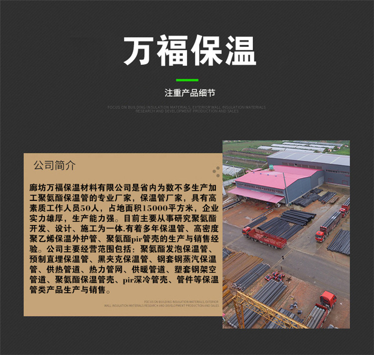 廊坊万福保温主要生产:黑夹克管皮,高密度聚乙烯外套管,玻璃钢缠绕管道,聚氨酯直埋保温管,钢套钢蒸汽保温管,保温外玻璃钢纱缠绕管道,聚氨酯管材,温泉专用保温管,本公司工程部专业承揽保温工程、热力管道、蒸汽管道、小区供暖管道工程。也可根据客户要求“量身定做”各种异型产品,做到科学设计,合理施工。公司凭借着公司产品优越的品质、合理的价格、完善的服务,诚信的行为,成功参加了许多大型工程建设和改造。