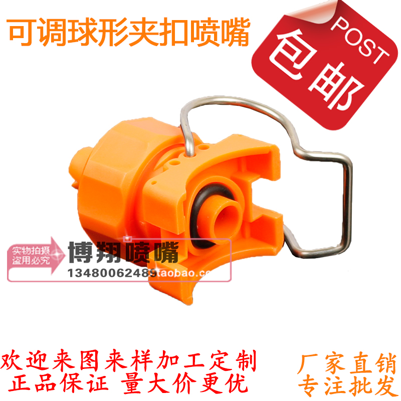 夹扣式喷嘴由夹扣底座(开孔Φ14-20mm)、可拆螺纹帽盖、可调球头三件组成,该类喷嘴底座有三孔位预留,此结构可以配合双夹扣和单夹扣调节管子外径不同时的夹紧度。