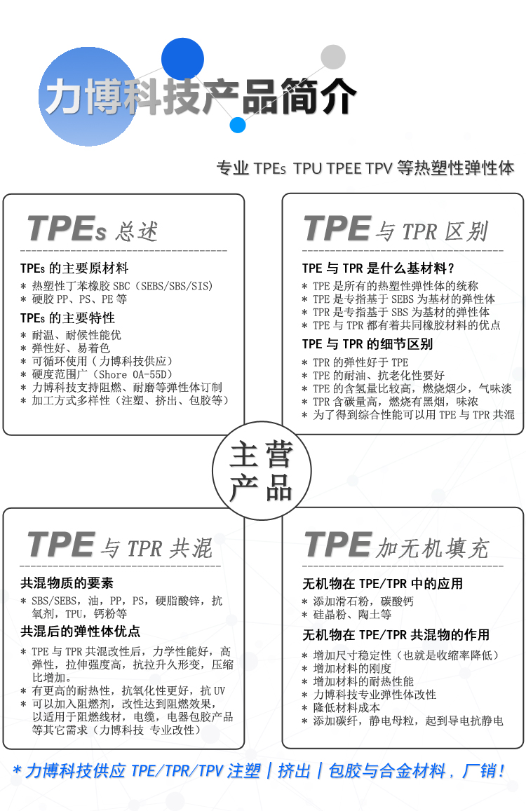 产品系列有TPE、TPR、TPU的环保,耐侯,低磨耗,高回弹,注塑包胶,阻燃改性等;