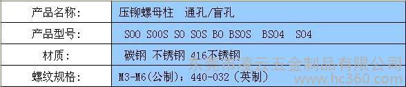 压铆螺母柱,也称压铆螺柱或螺母柱,多应于铆接PCB板,线路板,及各种板金,机箱,机柜等。 压铆螺母柱:SO//SOS,SOOS/SO4/SOA生产范围;M3-M6 4#-40到10#-32 L长度;上**长可50MM,或根据用户要求生产更长的规格.材质:12L14/12L15快削钢/不锈钢SUS303/铝6061/不锈铁SUS416 ) 我公司也根据用户需求生产挤压螺母柱及接地螺母柱。表面多采用3Cr+蓝白锌环保电镀。除六角端有通孔盲孔之分外,其内螺纹亦可跟据用户需求做成半牙或全牙型.