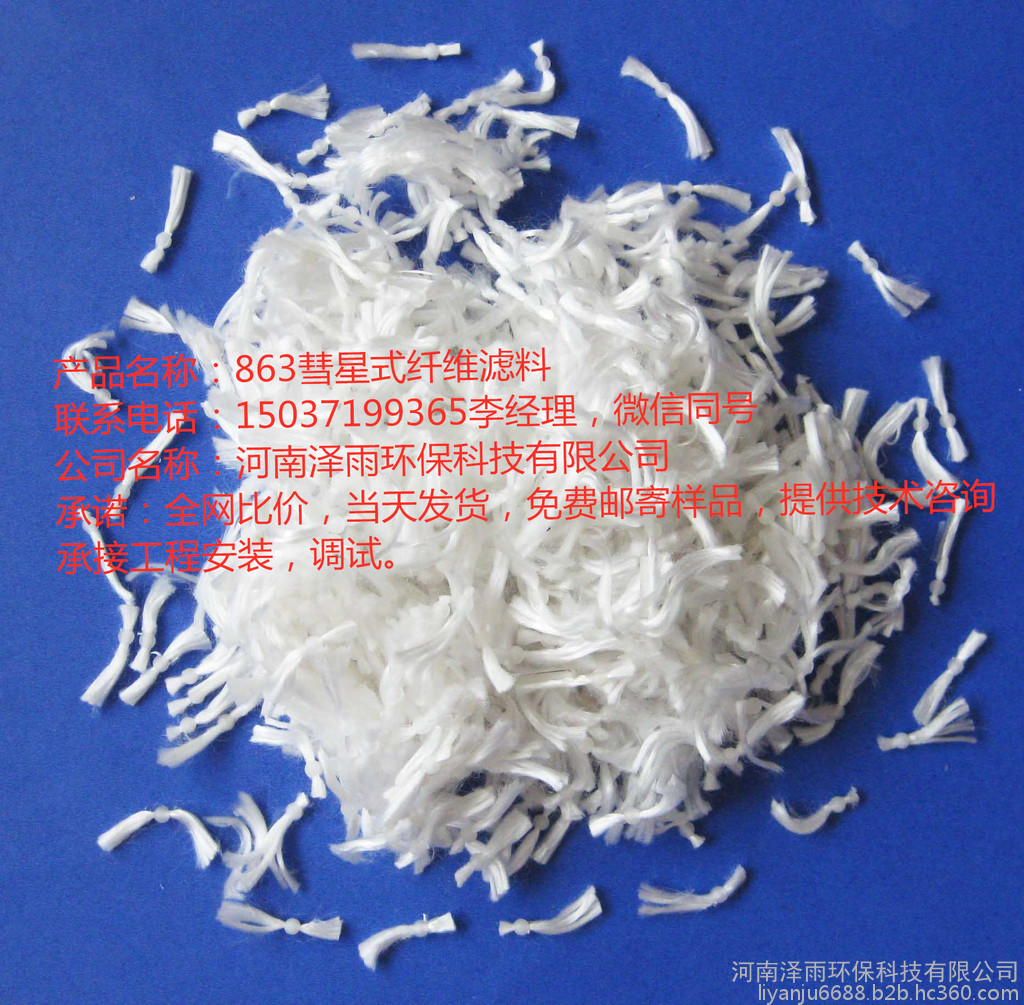 泽雨环保863彗星式纤维滤料是采用.....成果,生产的纤维滤料使用期限比普通纤维球长1-2倍,而且不容易分散,过滤精度高,反冲洗容易。