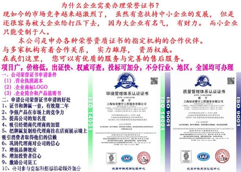 中国品牌办理、CCTV央视展播品牌,申请重合同守信用企业、申请ISO9001体系认证、企业工程施工资质办理、绿色环保产品证,企业信用评价AA证、办理企业荣誉资质证书、办理品牌证书、名优产品证、企业工程资质认证、我公司本着“诚信、专业、优质、高效”的宗旨为客户提供全方位的服务!本公司愿与广大的新老客户真诚合作、携手共进!