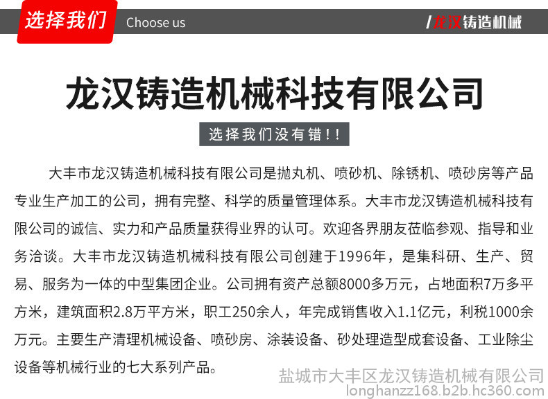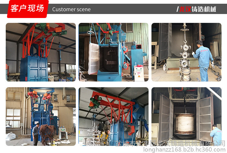 龙汉铸造机械生产的吊钩式清砂机用于专门清理箱体类铸件、结构件的铁锈、氧化皮等。