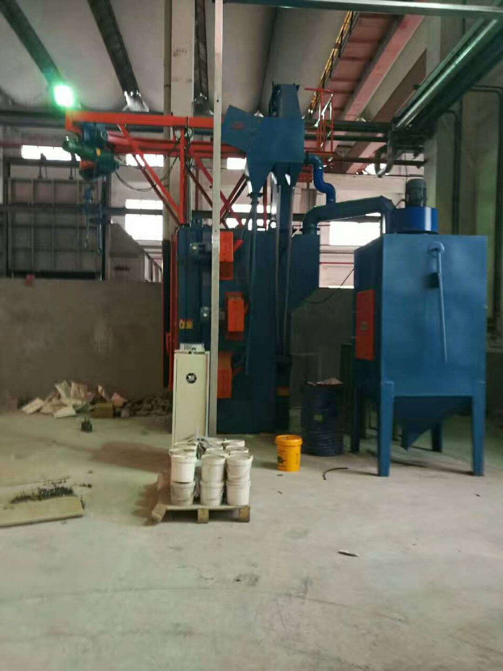 一、专门清理箱体类吊钩式铸件清砂机结构组成:主要由清理室、大门、轨道、吊钩、提升机、检修平台、供丸系统、溜槽及涨紧装置、螺旋输送器、分离器、抛丸器、除尘器和电气系统等组成。