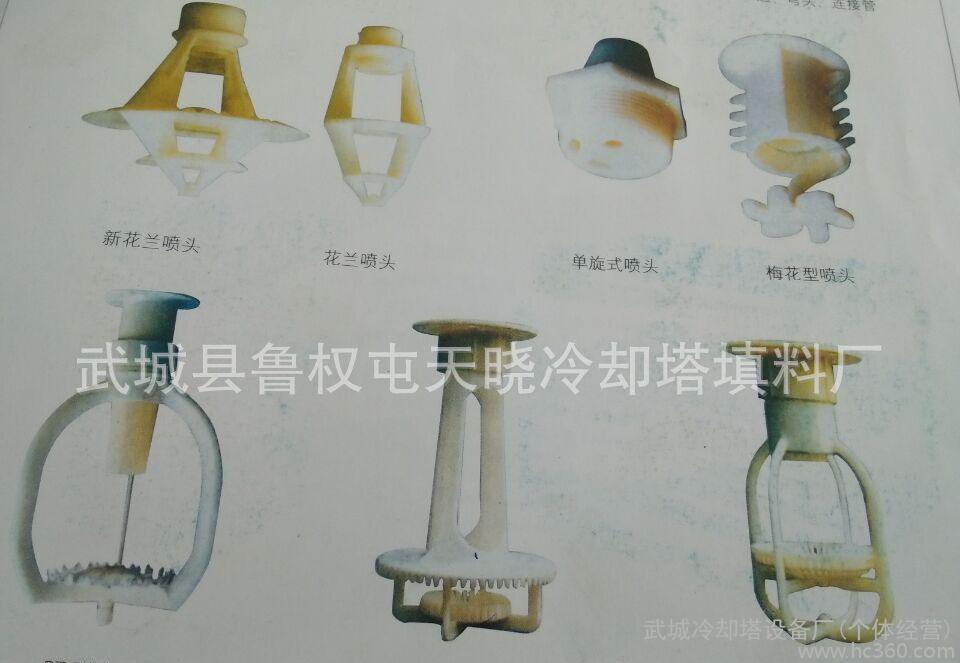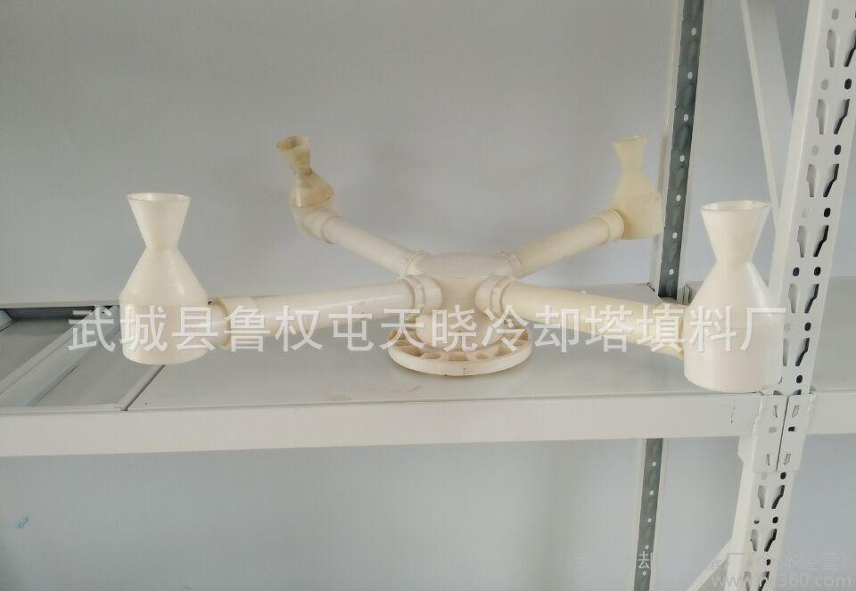 喷溅装置的工作原理是:压力水沿切向水平进入蜗型喷头,在腔体内旋转并向下作回旋运动,从下方喷嘴喷出。水喷出后形成一伞状旋转水体,冲击溅水条及溅水叶片,溅散成均匀分布雾状细小水滴,下落到填料顶面。散热效果好,特别适用于冷却水。