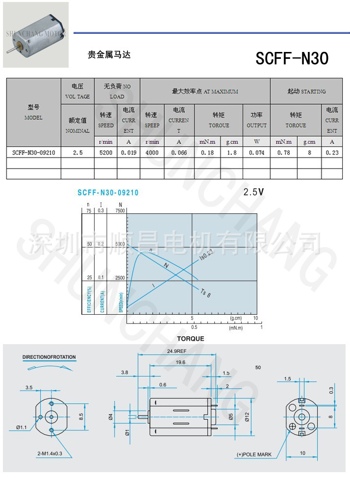 以下参数为FF-030电机其中一款参数,电机电压和转速在一定范围内可按照客户要求定制。