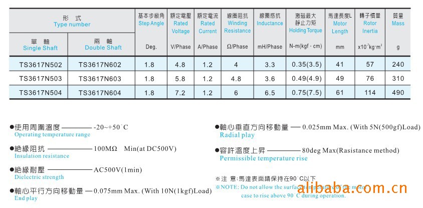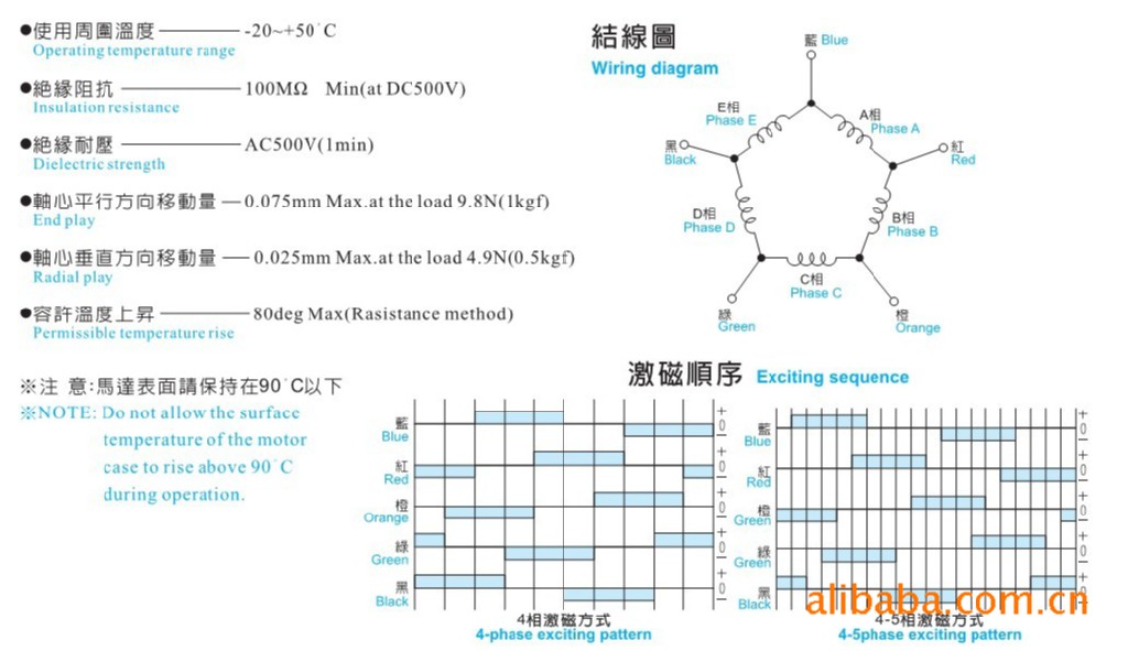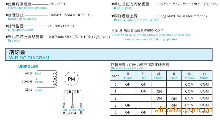 *使用周围温度【-20-+50°C 】 *轴心垂直方向移动量0.025mmMax. *绝缘阻抗100MΩ *容许温度上升80degMax *绝缘耐压AC500V *轴心平行方向移动量0.075mmMax.***注意:马达表面请保持在90°C以下.