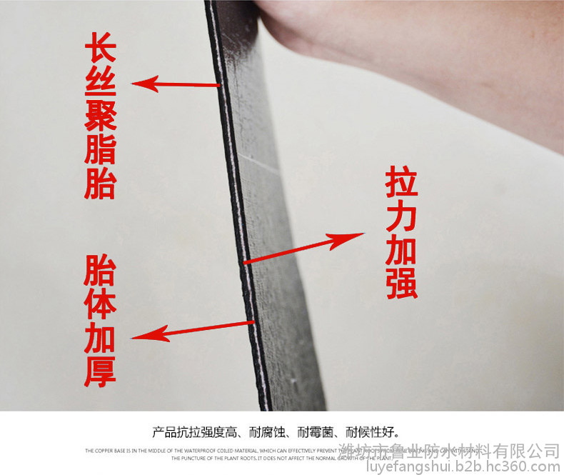 8、优异的柔韧性和伸展性、拉伸强度高 **的尺寸稳定、机械强度高、耐侵蚀性、耐根系渗透性、耐候性和抗紫外线性、抗冰雹性。