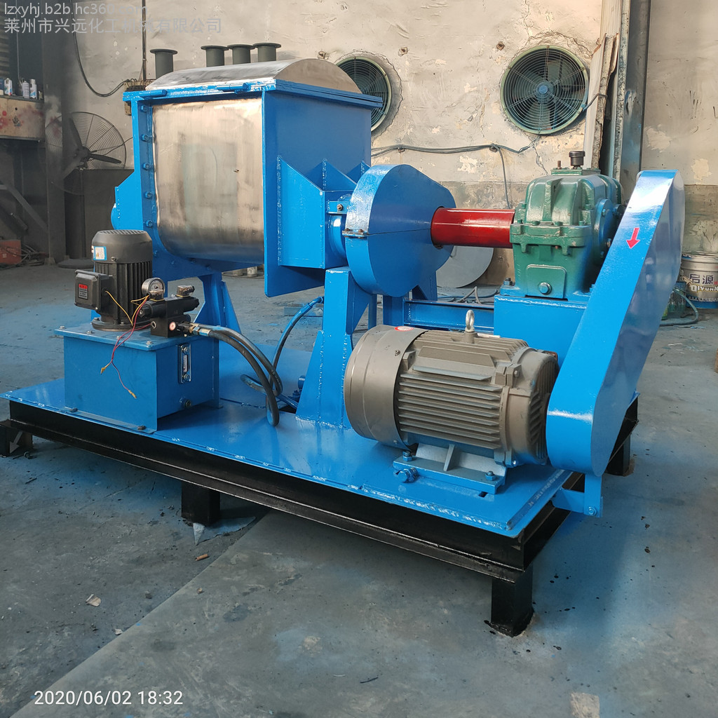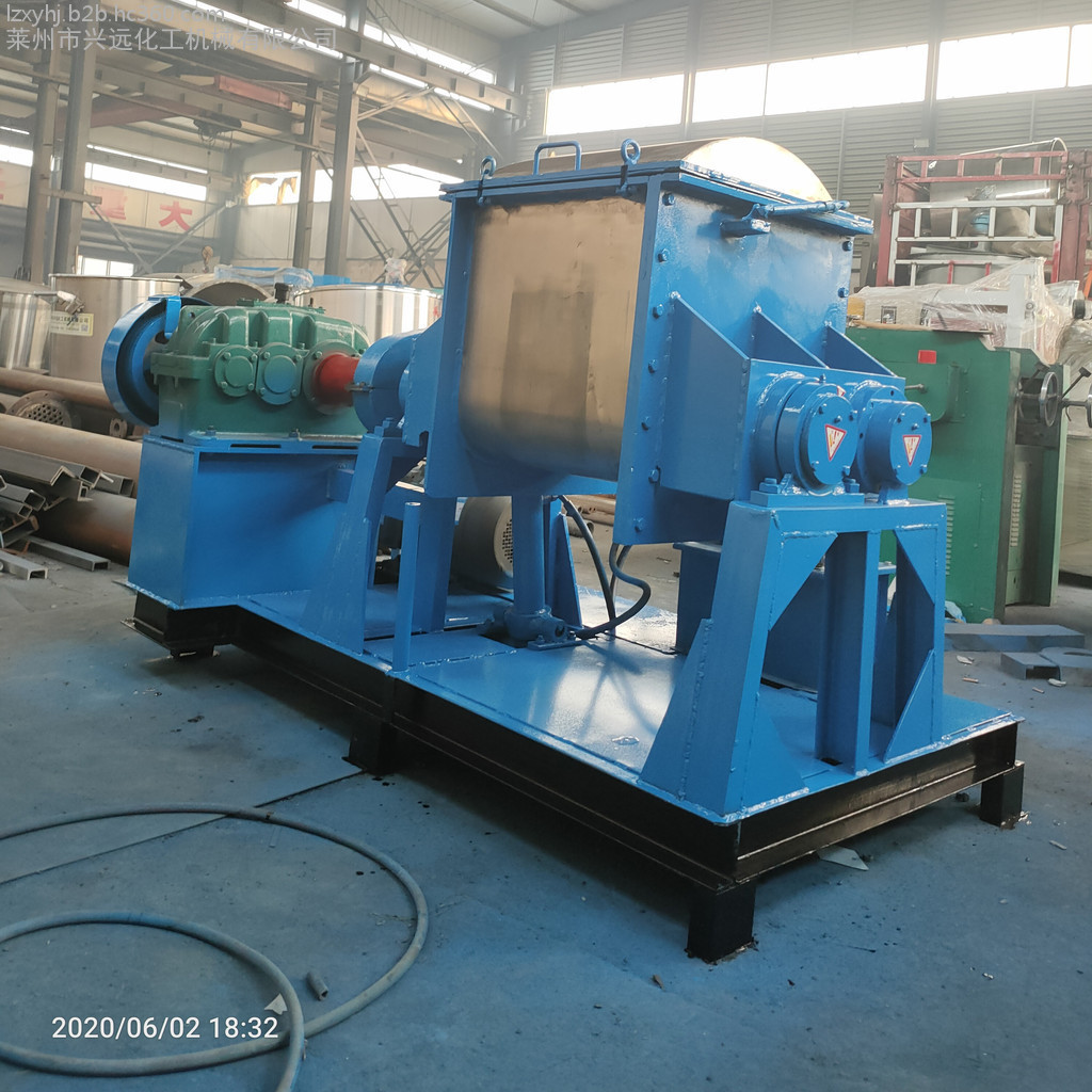 捏合机可制成普通型、压力型、真空型、高温型四种,调温形式采用夹套、蒸汽、油加热、水冷却等方法,采用液压翻缸及启盖。出料方式有液压、翻缸倾倒、球阀出料,螺杆挤压、液压翻板出料等。