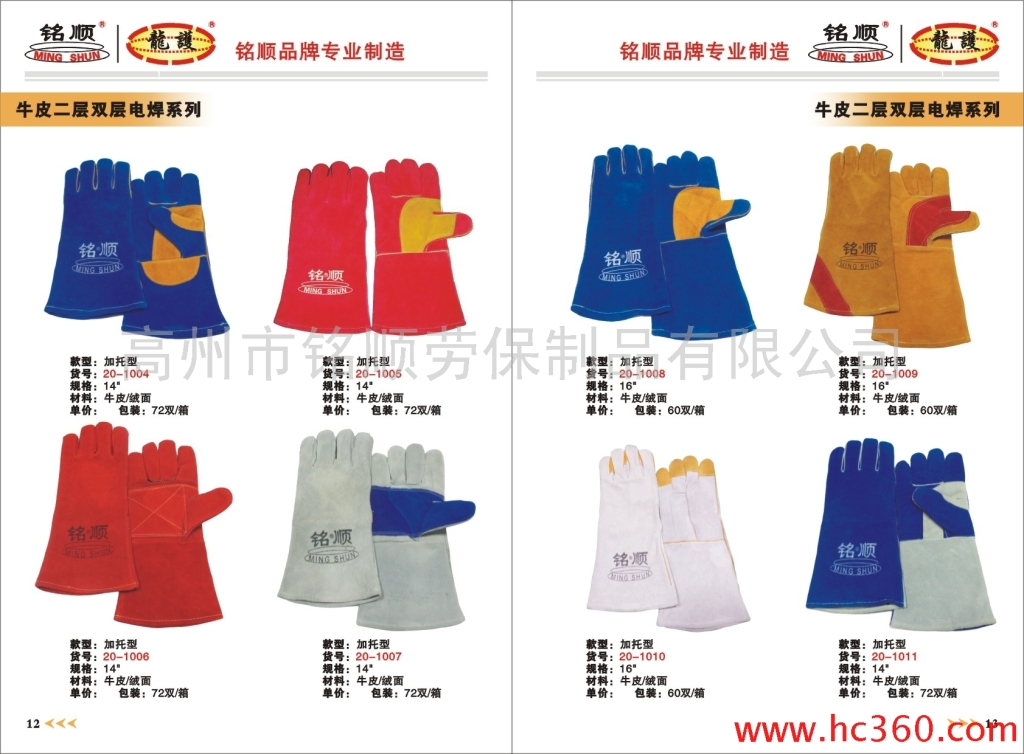 铭顺公司生产的20-1009焊接手套、劳保手套、工作手套,质量保证,产品三包,颜色和款型可根据客人要求生产,单价按需求确定,适合五金机械厂,汽车制造厂,玻璃厂,建筑等的焊接作业人员使用。欢迎咨询洽谈。