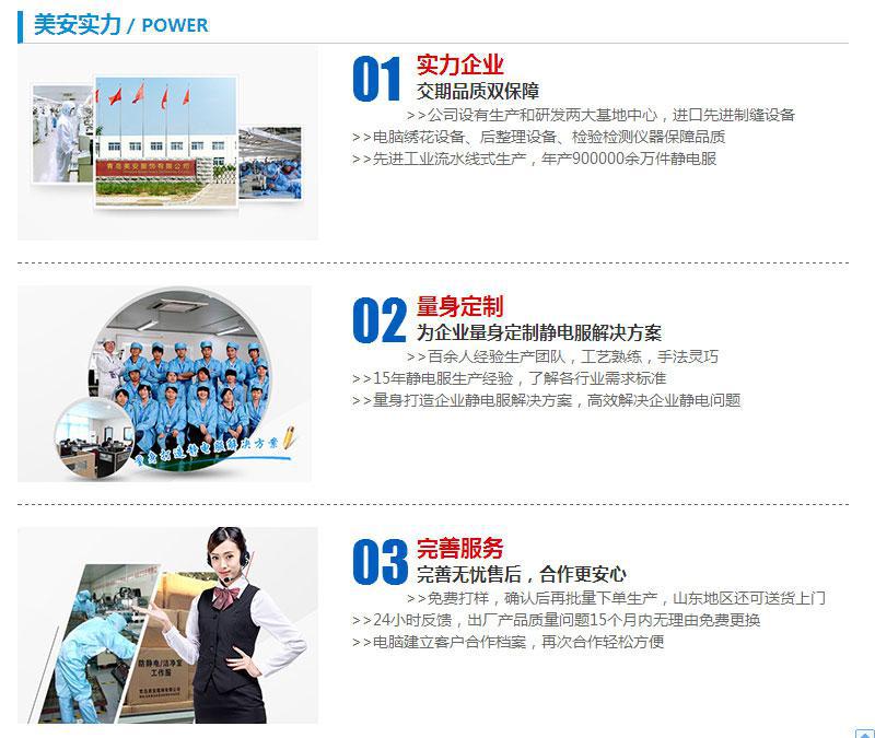 青岛美安静电科技生产的各种款式的防静电连体服受到海信、海尔等大型企业的青睐,产品遍布华北、东北的各大中型电子企业、医药行业等,青岛美安静电产品质量优、价格物超所值、销售灵活等特点,深受广大客户好评。咨询热线:13589385496。