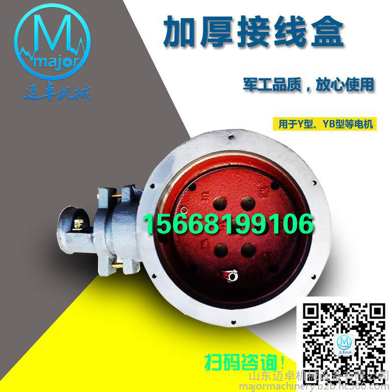 我单位生产的防爆电机接线盒通过安监认证,合法合规,请客户们放心使用,采用专用材质,寿命长,常用电机接线盒孔距规格45*45、50*50、55*55、60*60、90*90、100*100、120*120,常见外观形状有三角形、正方形、圆形。常用电机功率为17KW、30KW、37KW等。颜色根据生产批次不同,具体以实物为准。也可普通电机改防爆电机接线盒。本品应对于普通不涉爆环境安检要求更换防爆电机的情况,为节约工厂生产成本的普通电机改装用防爆电机接线盒。