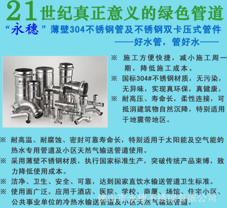 佛山市永穗不锈钢有限公司利用**先进的生产工艺,引进成熟的国外成型技术,自主研发出同行先进的大型成型设备,一次成型,且合格率高达95%以上,有效确保了产品质量和效率,制造出符合卫生级饮用水标准的**不锈钢管材及不锈钢双卡压式管件,产品被广泛应用于冷热水、直饮水、供暖、燃气、食品、制药、医疗气体输送、化工及市政、家装生活用水供水等大型工程项目