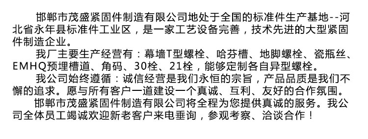 邯郸市茂盛紧固件制造有限公司为您提供**的服务以及高质量的产品。本公司以诚信为本,我们恪守对品质的要求,对细节的打造。对客户的关怀、高精度、高性能、高可靠性使我们一贯坚守的信条。