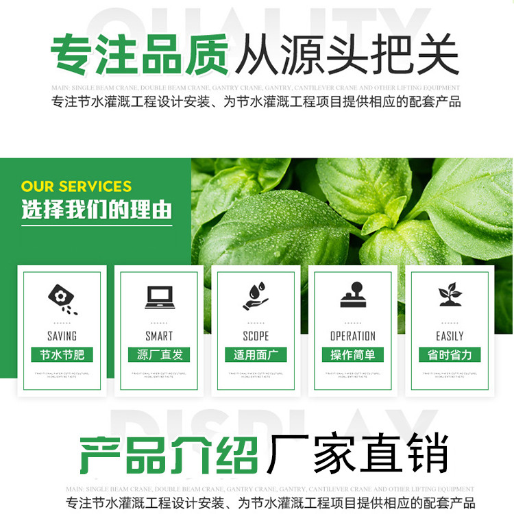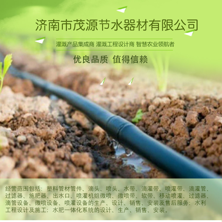 | 滴头是通过专用打孔器,在PE管上打孔安装,再由主管0.05Mpa-0.4Mpa压力水输送到支管,采用压力补偿滴头出水均匀的特性,对作物进行浇灌的一种技术。 压力补偿滴头 优势: 优势,防倒虹吸,极大提高防堵塞性能!压力补偿.长距离铺设或压力波动时保持恒流,灌水均匀度高!自动清洗,起始水流冲刷流道,抗堵塞性能好,灵活方便,滴头可安装在各种规格(∮16-∮32mm)的软管上,既可预先安装在毛管上,也可在施工现场安装。 应用: 适合于各种地形及作物,特别是灌区内坡度起伏较大的情况,适合于要求滴灌管铺设长度较大的情况,适合于滴头间距变化的情况,系统压力不稳定时。 规格: 滴头流量:4L/H:8L/H 压力补偿范围:80-400Kpa。 |