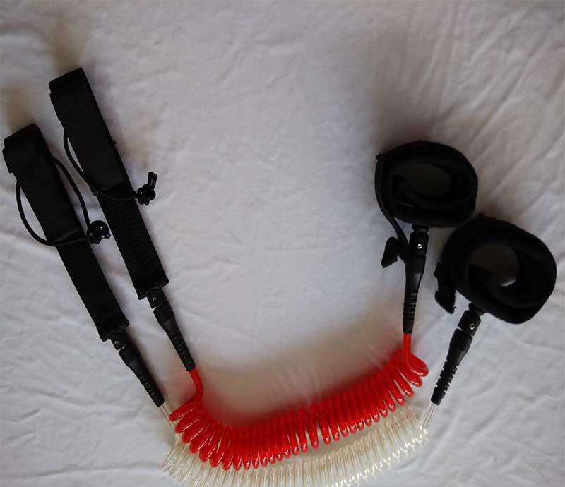 一般来说,依所搭配的冲浪板长度选择相同or接近长度的脚绳即可,脚绳的直径(粗细)对承受外力也有影响,冲大浪自然应搭配粗的脚绳,小浪则可选择细的脚绳,否则会造成累赘,例如:使用8呎长冲浪板可搭配8呎长的脚绳(粗细因环境而改变),另外通常有双轴承(double swivels)的比单轴承的好,比较不容易缠到。