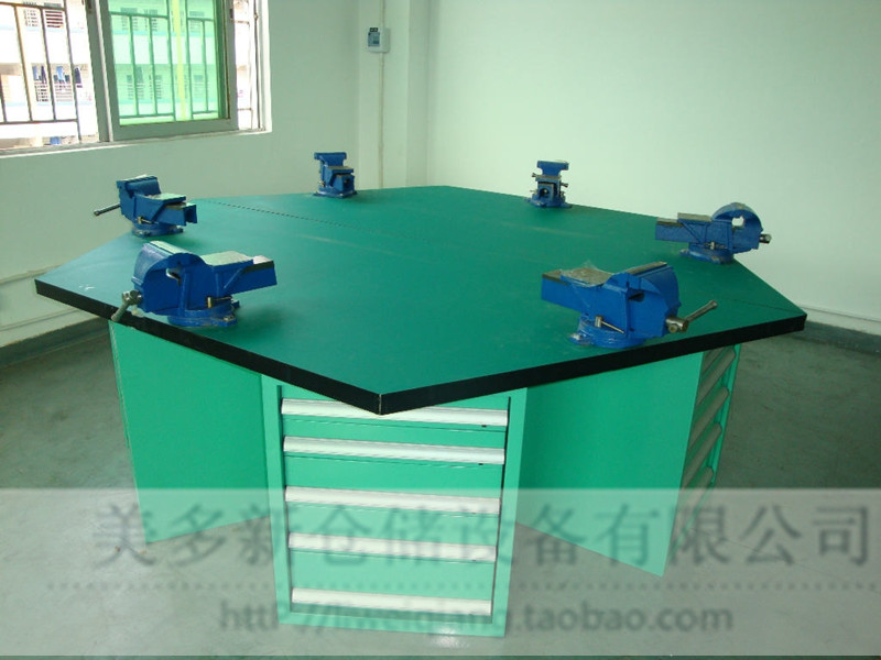 | 1.六角工作台边长为1200MM 台子含吊柜高度为800MM 2.台子配套6个落地柜 每个落地柜有5个抽屉 3.台面为50MM厚复合桌面/榉木桌面 具体价格具体商议。 4.吊柜采用1.0MM冷轧钢板制作,每个抽屉承重≤80KG 5.吊柜整体颜色默认为电脑灰色,抽屉颜色为蓝色,抽屉把手为铝合金把手。 联系人:李先生 手机:13538061510 电话:0755-29375165