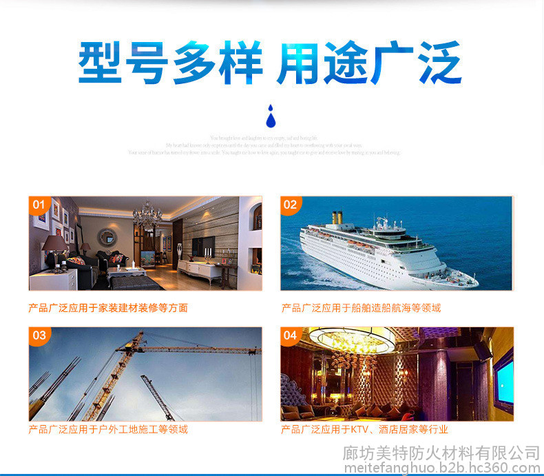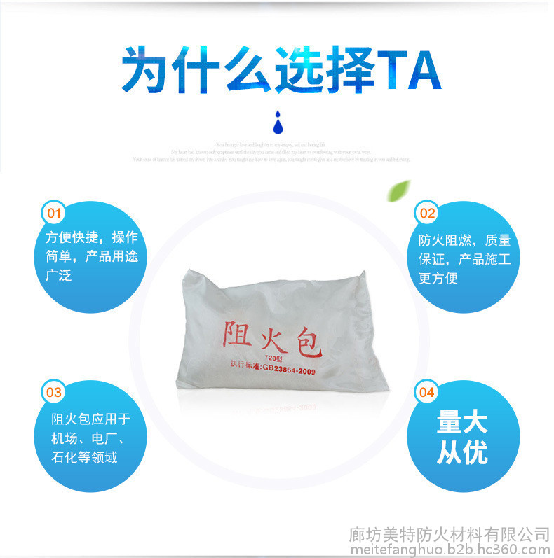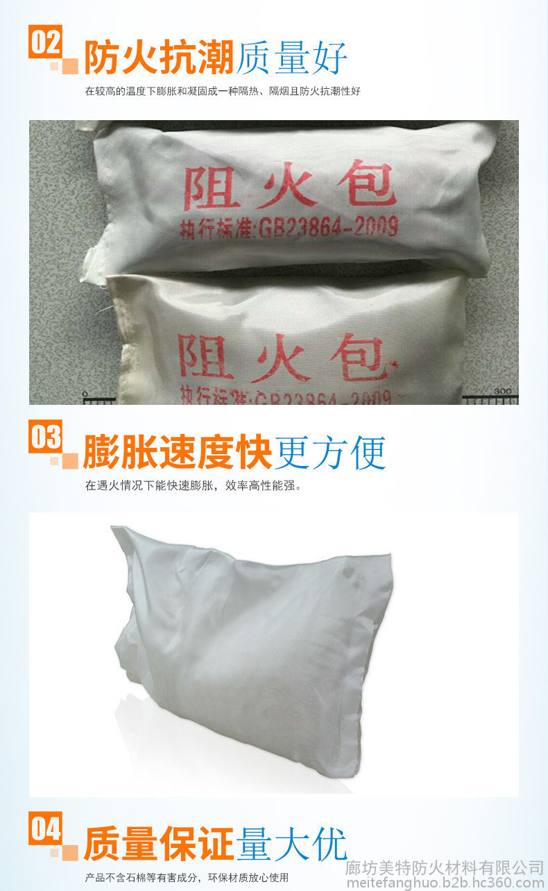 公司经营项目:防火包(阻火包)、防火堵料、防火涂料、防火隔板、防爆胶泥、钢结构防火涂料、电缆防火涂料、防火包带、防火密封胶、新型阻火模块、防火模块、阻火圈、自粘性防火包带等产品。公司产品应用范围广,主营用于:航天、发电厂、工矿企业、高层建筑、石油石化、汽车库、石油钻井平台等。产品畅销全国29个省、市、自治区,并在全国主要城市设有区域销售部。形成了健全的经销网络。