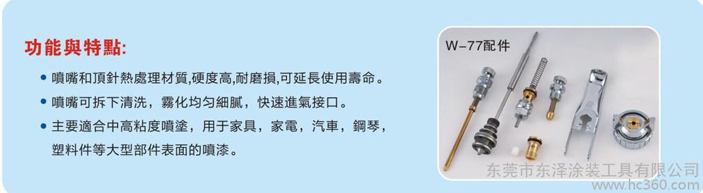 1、此款W-77喷枪适合于中粘度涂料(底漆)、粘合剂的喷枪;喷嘴和顶针热处理材质,硬度高,耐磨损,可延长使用寿命。