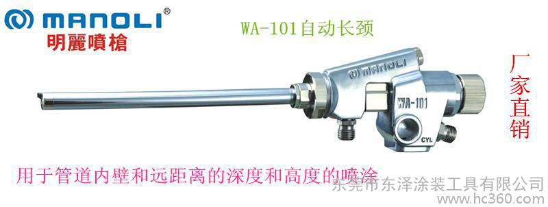 供应明丽WA-101喷枪,长管自动WA-101喷枪。适用于管内壁和远距离的深度和高的喷涂。此款明丽长款自动WA-101喷枪其管长180mm,其喷嘴口径为0.6mm;其涂料喷管直径12mm。此款自动喷枪喷嘴采用特殊设计,涂料附着率强,喷涂速度快。操作方便,雾化性能好,油漆损耗低。欢迎广大需求者来电洽谈!