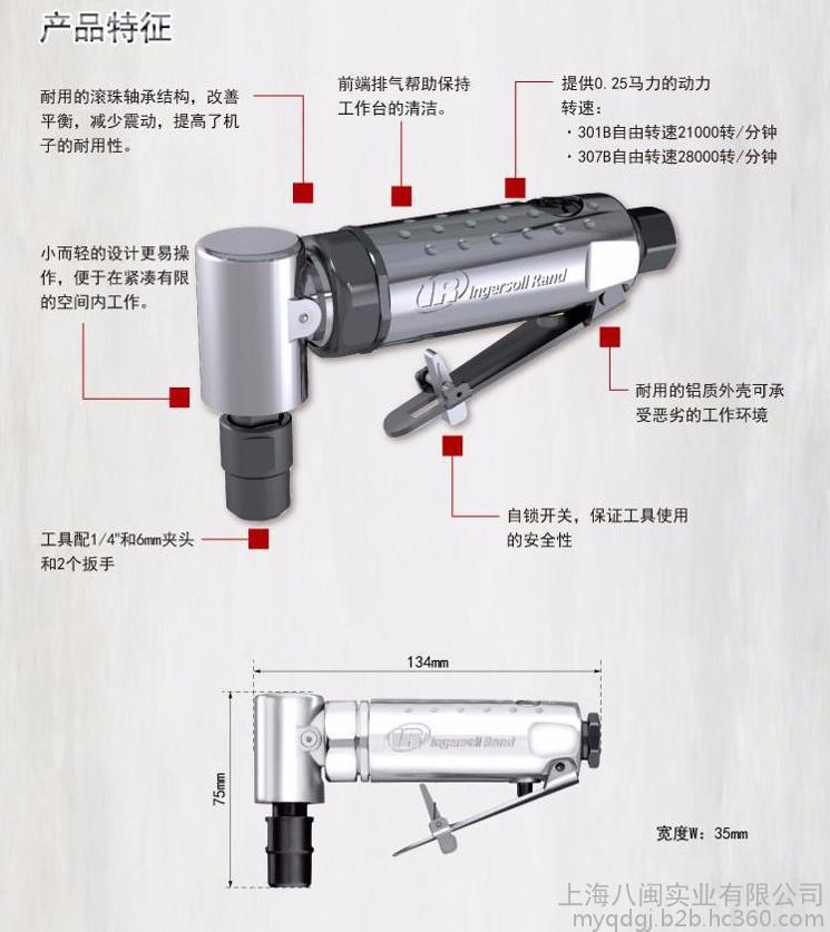 型号:301B系列 品牌:英格索兰Ingersoll Rand 名称:气动修磨机 类型:直角型 加工定制:否 夹头尺寸:1/4” 额定功率:0.19kw 自由转速:21000rpm 长度:134mm 重量:0.46kg 平均耗气量:170l/min 负载耗气量:680l/min 噪声级:92dba 进气口:1/4in **小软管管径:10mm