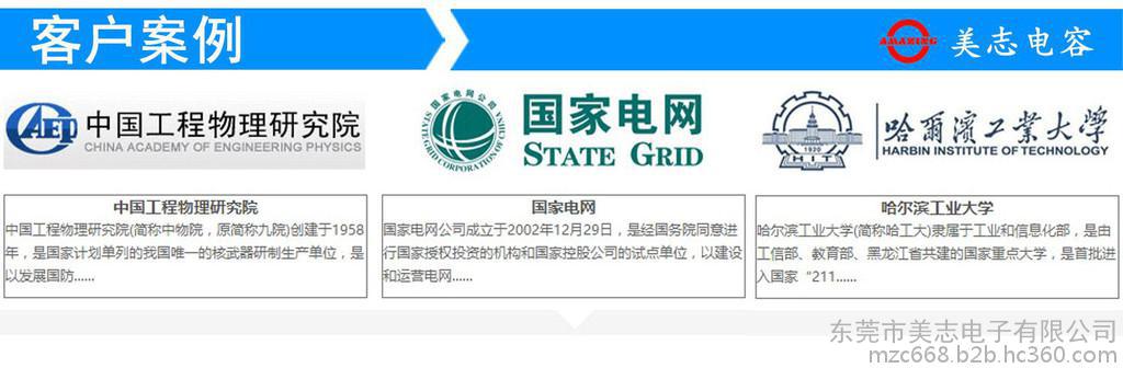 东莞美志于2007年4月16日成立,是国家介电陶瓷研究所下设的集研发设计,制造,销售为一体的高压电容器公司.目前有三大科技成果挤身于行业前列: 全球首款脉冲寿命超过百万次的脉冲高压陶瓷电容器--PC系列、 全球首款TC变化率小于1的零局放高压陶瓷电容器--GC系列、 全球首款容量超20NF的大容量高频陶瓷电容器--FC系列 ,目前美志电容已成为多家医疗检测,智能电网等领域大型用户的元器件供应商与产品开发合作伙伴,特别是在高精密度,零局部放电,高低温环境,高频脉冲等领域,美志产品更成为无可取代的优势! 具有超高电压和超高工频的特性,局放低,内阻小,适合于航空航天器,智能电网。