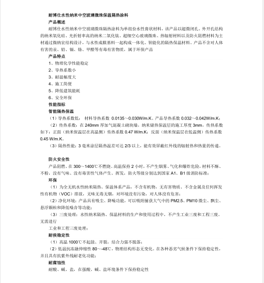 水性纳米中空玻璃微珠保温隔热材料为单组份水性膏状材料,该产品以超微闭孔、外开孔结构的纳米氧化硅、光折射率高的纳米二氧化钛、超细空心玻璃微珠、热辐射材料以及防火阻燃材料为主材通过微纳宏结构设计,与水性成膜基料一起构成一体化、智能化的隔热保温材料。产品不含对人体有害的汞、铅、镉、铬等有毒有害物质,属于环保产品。