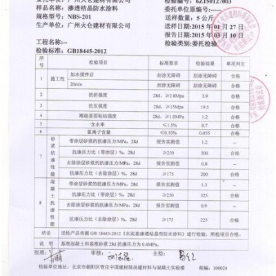 1、 与基材粘结力强,浆料中的活性成份可渗入水泥基面中的毛细孔,微裂纹并产生化学反应;与底材融为一体而形成一层结晶致密的防水层。